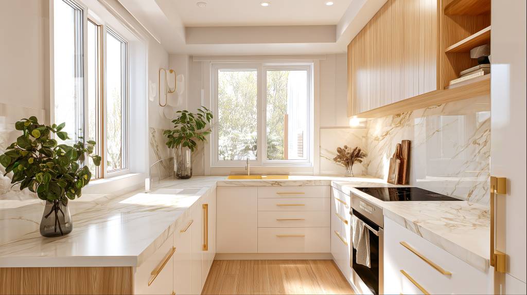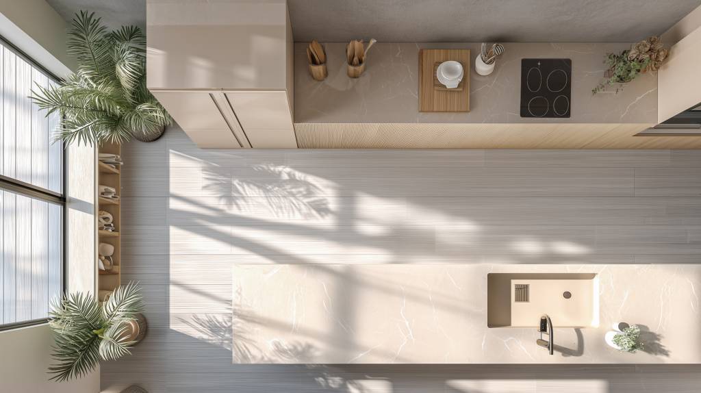 This kitchen design blends modern elegance with understated functionality, creating a refined culinary space that’s equally suited for everyday use and sophisticated entertaining. The layout centers around clean lines and tactile contrasts, delivering both aesthetic clarity and spatial efficiency.