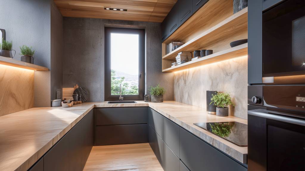 The cabinetry is finished in a soft matte tone, offering a minimalist backdrop that allows the natural textures of wood, stone, and metal to stand out. The island unit, wrapped in a rich wood veneer with fluted detailing or a natural stone finish, anchors the space while doubling as a prep zone and social hub.